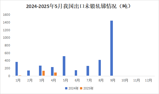 未鍛軋銻出口方面,2025年5月中國未鍛軋銻出口量為0噸,環(huán)比下降100%,同比下降100%;1-5月未鍛軋銻出口量為247.0噸,同比下降84.0%。