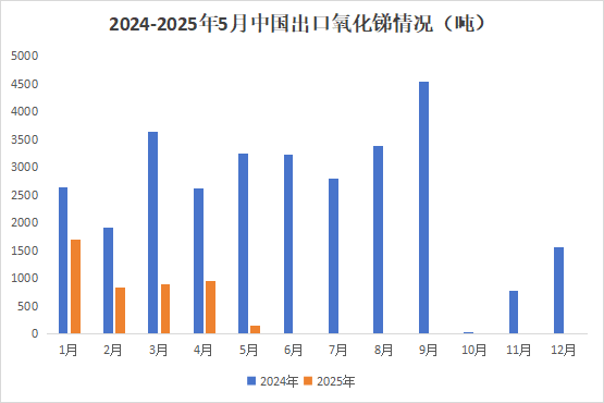 據(jù)海關(guān)統(tǒng)計(jì)數(shù)據(jù)顯示,2025年5月中國氧化銻出口量為159.0噸,環(huán)比下降83.4%,同比下降95.1%;1-5月氧化銻出口量為4563.6噸,同比下降67.7%。