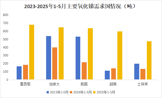 分國別來看,1-5月中國出口氧化銻主要銷往墨西哥、加拿大、泰國、越南、土耳其等國家和地區(qū),分別為墨西哥681.5噸,同比上升268.4%;加拿大648.0噸,同比上升62.0%;泰國637.5噸,同比上升195.1%;越南599.6噸,同比上升320.1%;土耳其478.0噸,同比上升250.7%。