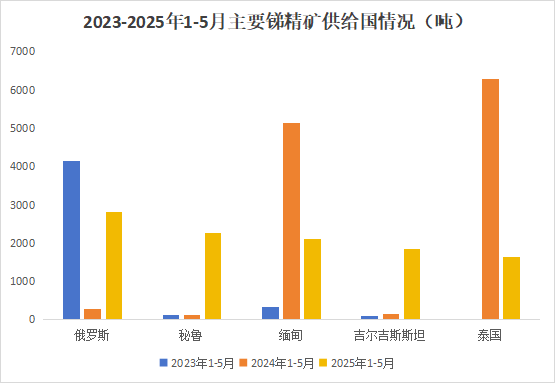 分國別來看,1-5月中國進(jìn)口的銻礦砂及精礦主要來自俄羅斯、秘魯、緬甸、吉爾吉斯斯坦、泰國等國家和地區(qū),分別為俄羅斯2827.3噸,同比上漲918.6%;秘魯2268.8噸,同比上漲1565.7%;緬甸2113.1噸,同比下降59.0%;吉爾吉斯斯坦1865.0噸,同比上升1179.7%;泰國1640.1噸,同比下降73.9%。