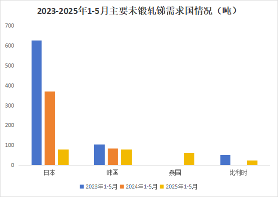 分國別來看,2025年1-5月中國出口未鍛軋銻銷往日本80.0噸,同比下降78.4%;韓國80.0噸,同比下降6.0%;泰國62噸,去年同期沒有出口泰國未鍛軋銻;比利時(shí)25噸,去年同期沒有出口比利時(shí)未鍛軋銻。