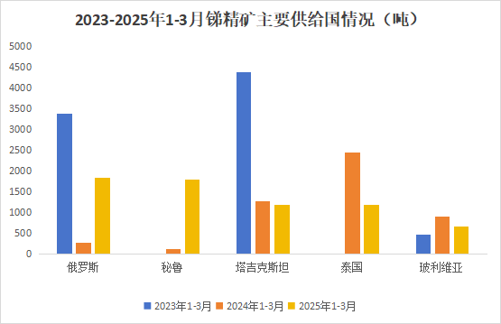 分國別來看,1-3月中國進口的銻礦砂及精礦主要來自俄羅斯、秘魯、泰國、塔吉克斯坦、玻利維亞等國家和地區(qū),分別為俄羅斯1852.6噸,同比上漲567.5%;秘魯1795.8噸,同比上漲13%;塔吉克斯坦1197.1噸,同比下降6.0%;泰國1185.0噸,同比下降51.8%;緬甸675.9噸,同比下降26.0%。