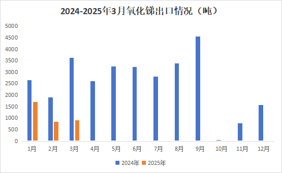據(jù)海關(guān)統(tǒng)計數(shù)據(jù)顯示,2025年3月中國氧化銻出口量為901.0噸,環(huán)比上升7.3%,同比下降75.2%;1-3月氧化銻出口量為3447.8噸,同比下降58.0%。