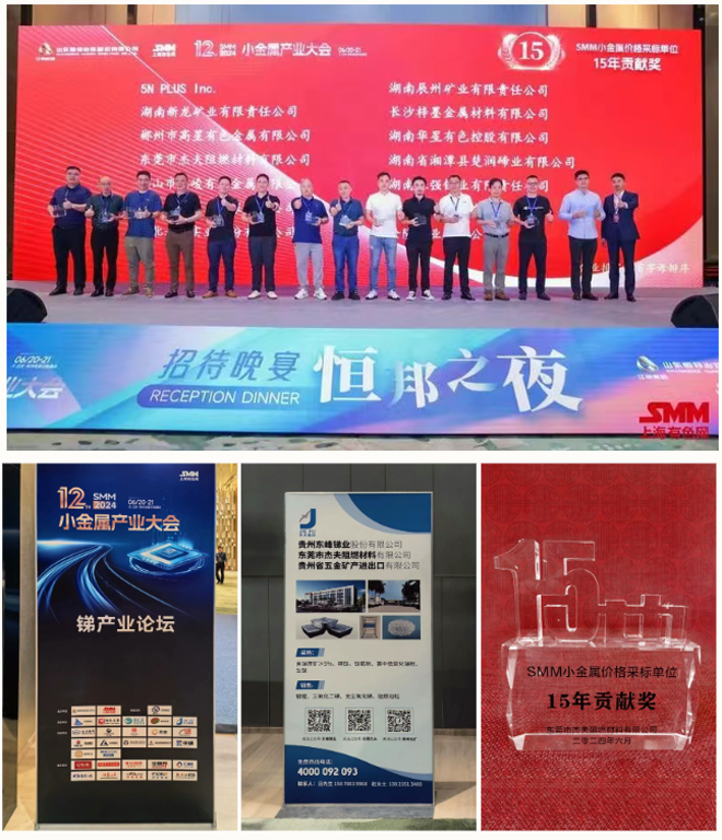 6月20日-6月21日,2024年SMM第十二屆小金屬產(chǎn)業(yè)大會在蘇州召開,貴州東峰銻業(yè)股份有限公司副總經(jīng)理、東莞市杰夫阻燃材料有限公司總經(jīng)理呂芳煒出席會議。SMM對各采標單位多年來所做出的貢獻和支持表示感謝,為15年以上的小金屬價格采標單位進行了頒獎。